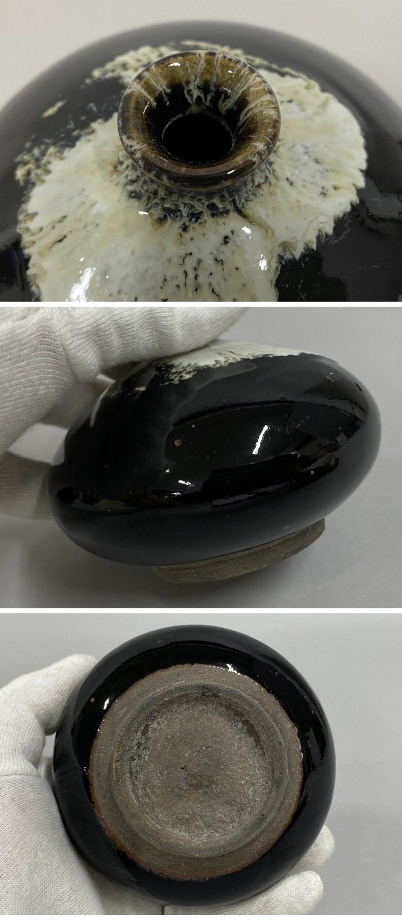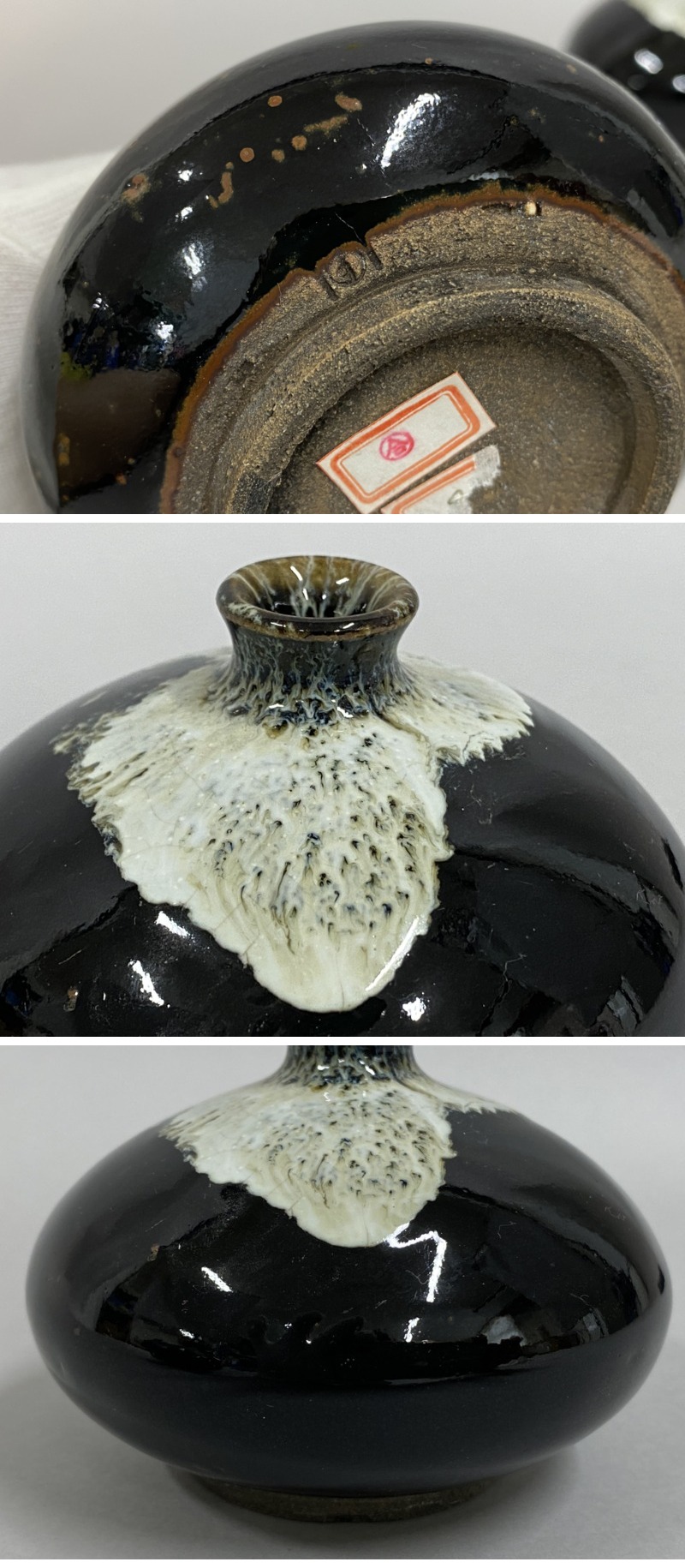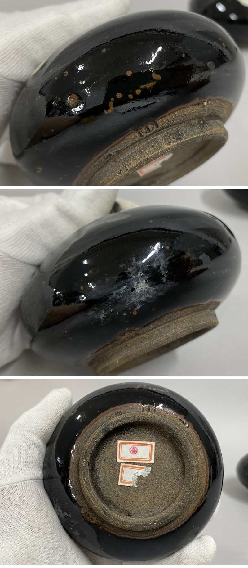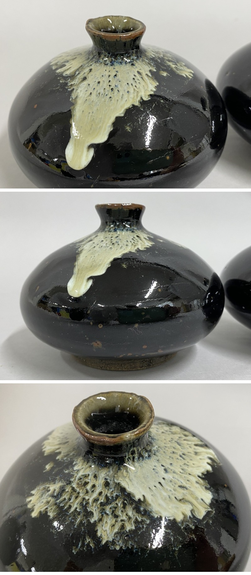 | ◇商品情報◇ | 当店の商品をご覧いただきありがとうございます!! 花瓶 油壷 まとめて 3点 黒釉 徳利 小瓶 一輪挿し 花入 油壺 平壺 壺 壷 花器 酒器 時代物 になります。 保管時の擦れ、薄汚れなどがございます。 目立つ欠けなどはございません。 また、シール跡や底にシール貼り付けがある物もございます。(画像参照) 胴径:約9cm~10cm、高さ:約7.5cm~11.5cm まとめて品のためサイズ感、状態などは画像を参考の上、ご検討をよろしくお願い致します。 ※まとめ出品の為、詳細な状態やサイズは記載致しませんのでご了承くださいませ。 ※目視チェックをしていますが、表記漏れや見落としや細かな擦れ・薄汚れなどがある場合もございますので予め画像をご確認の上でご入札をお願いいたします。 商品のトップ画像端に写っている茶筅はサイズ比較用の備品ですので付属はしません | ||||||||||||||||||||||||||||||
