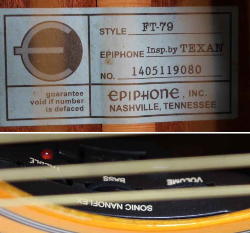 | □現状品□ Epiphone FT-79 insp.by TEXAN エピフォン テキサン エレアコ ※1―2弦で音詰まりあり(2733668N)  ■こちらは現状品となります ※1,2弦音詰まりがございます ・エレアコ音出し可(要別売CR2023ボタン電池2個) ・Epiphone エピフォン ・エレアコギター ・FT-79 ・ネック:少し順ゾリ ・弦高:1弦:約1+mm 6弦:約2+mm ・フレット:主観となりますがほとんどすり減っていません ・重さ:約2.2kg ■外観 ・ネックジョイント部塗装剥がれ有り(写真8) ・内部配線剥がれございます(写真8) ・使用に伴う打痕キズ、汚れございます >写真11 >写真12 >写真13 ■内容 ・ギター本体のみです  |