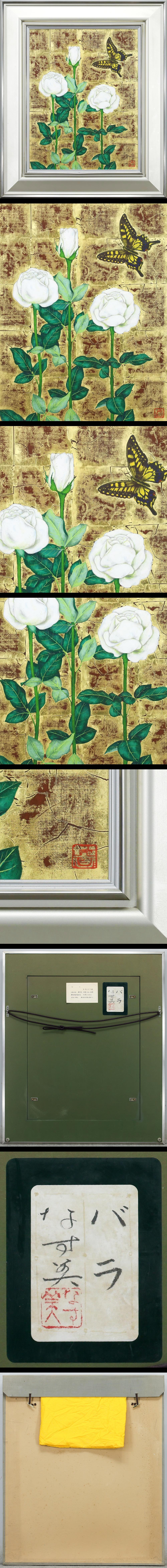【真作】【WISH】田島奈須美「バラ」日本画 10号 金箔 共シール ◆金地に咲く白薔薇と蝶 〇日展会員 師:伊東深水・橋本明治 #25093373
