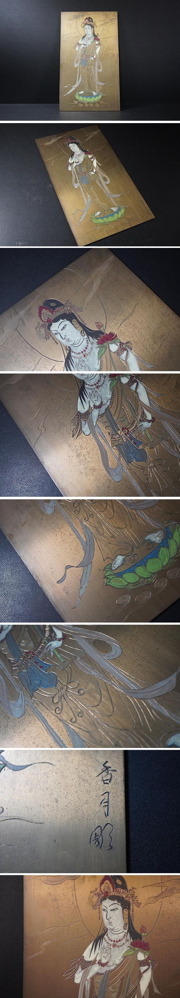 D5785 香月彫 銘 銅板片切彫 琺瑯彩 雲上観音菩薩像 (板厚0.3cm/縦36.5cm/重1.98㎏) 仏画彫刻