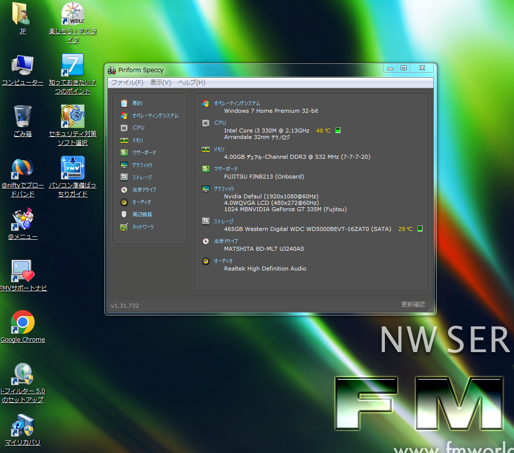 | ストレージ (ハードディスク) | HDD500GB...ソフトでチェック済【正常】 Windows 7 Home Premium 32bit リカバリー領域あり トラブル時に工場出荷時への復元もでき安心してお使いできます HDDに比べると起動やファイルの読み書きが大幅に高速になるだけでなく、 省電力、軽量、耐ショック性、低発熱のメリットがあります。 |