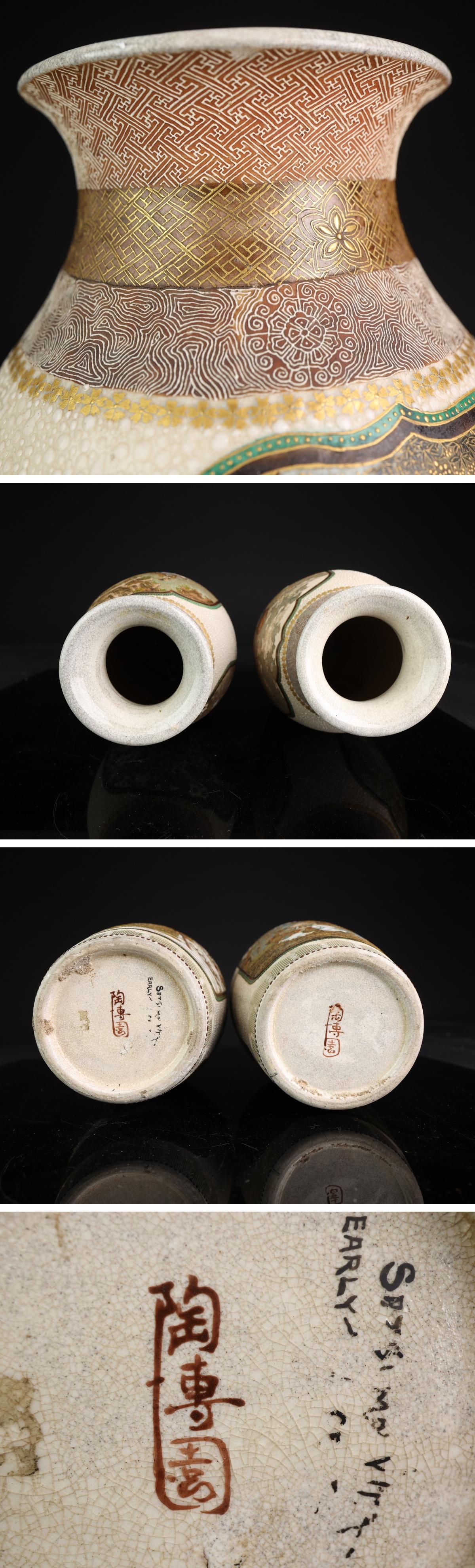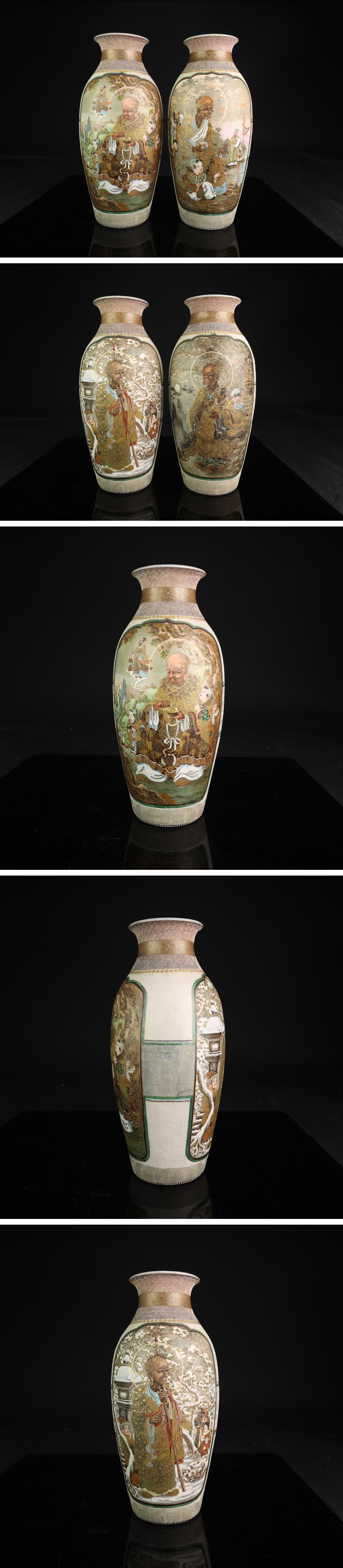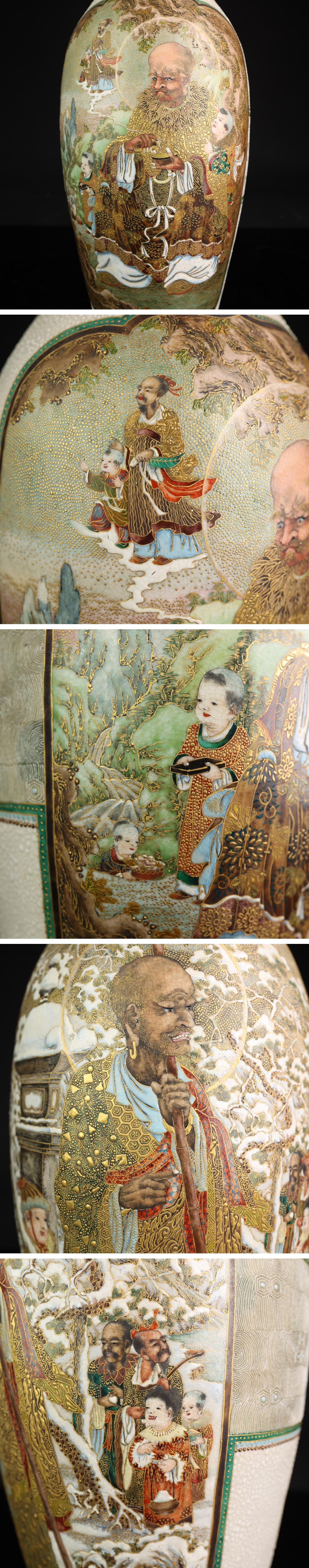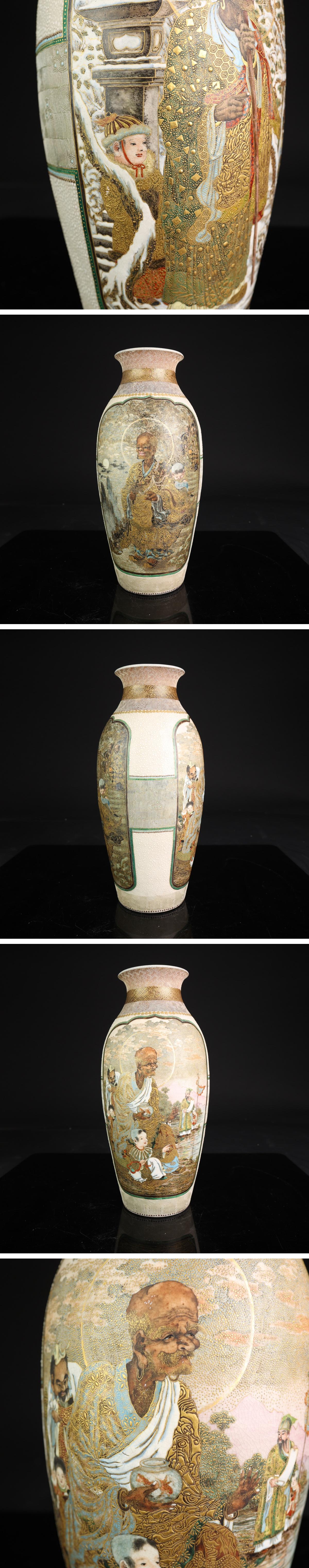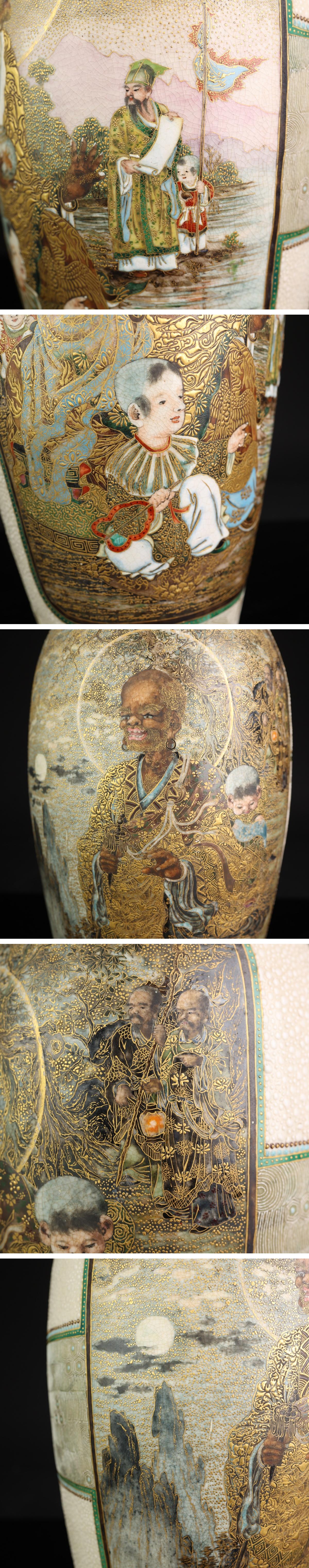 【志】D012薩摩花瓶一対 陶博園作 羅漢 人物 山水図 細密画 東京薩摩