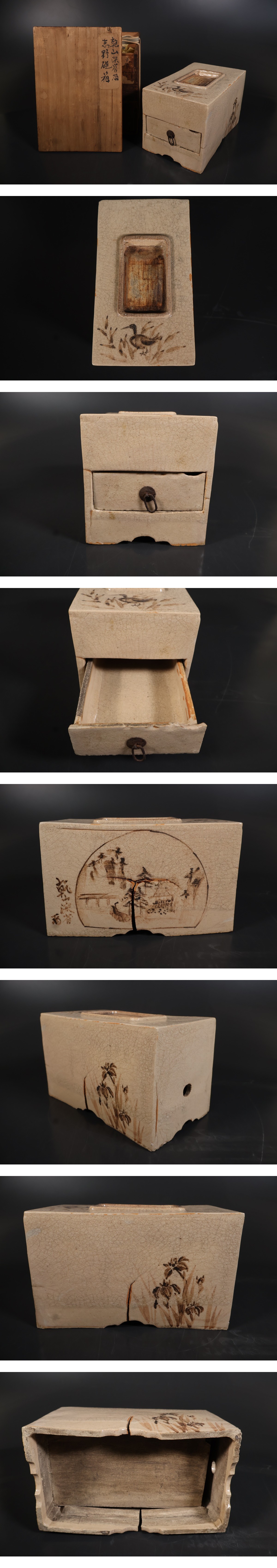 【和】(A3341) 時代古作 尾形乾山 乾山在銘 古清水陶製硯箱 古引出 保管箱有