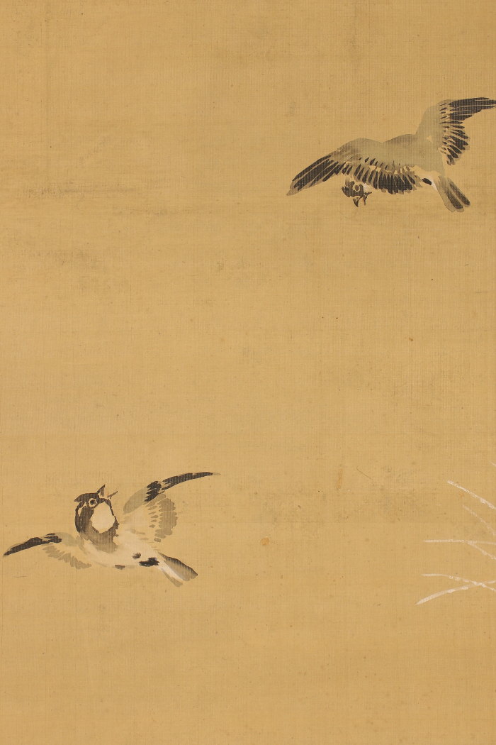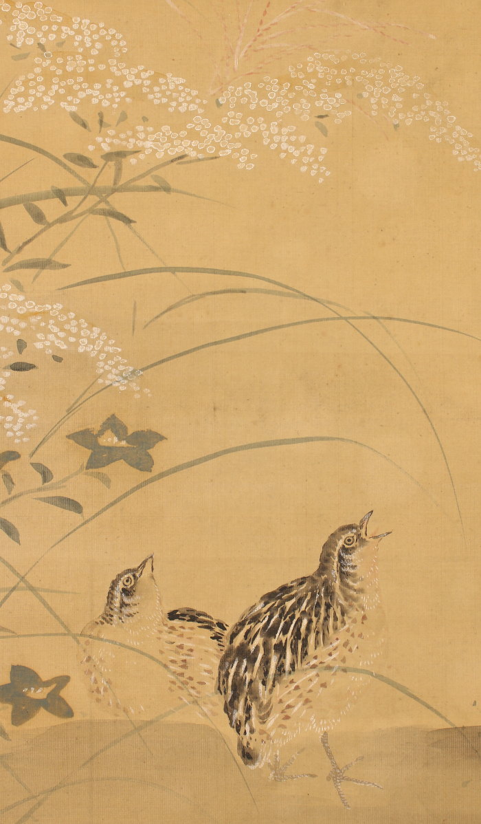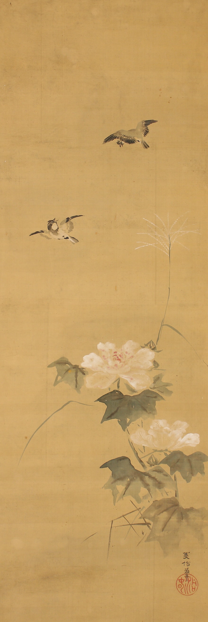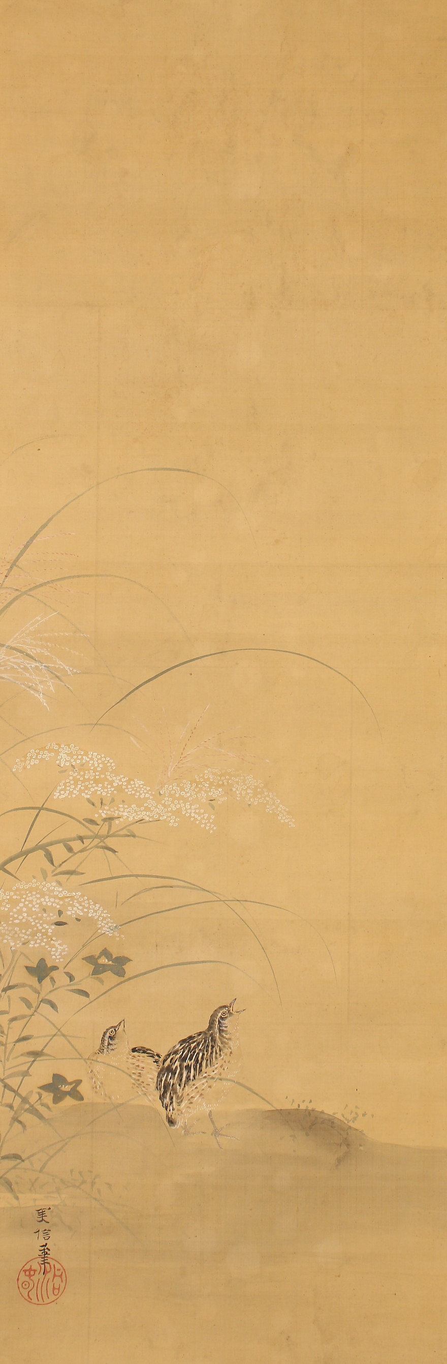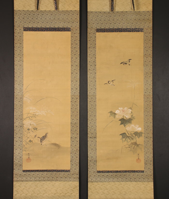 【模写】【伝来】am3946〈狩野洞春美信〉双幅 粟双鶉・花鳥図 駿河台狩野家 法眼 江戸時代