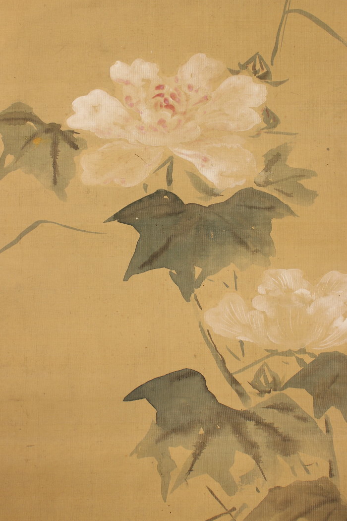 シミ、虫食い、本紙に浮き、絵の具の剥脱、表具に折れがあります。