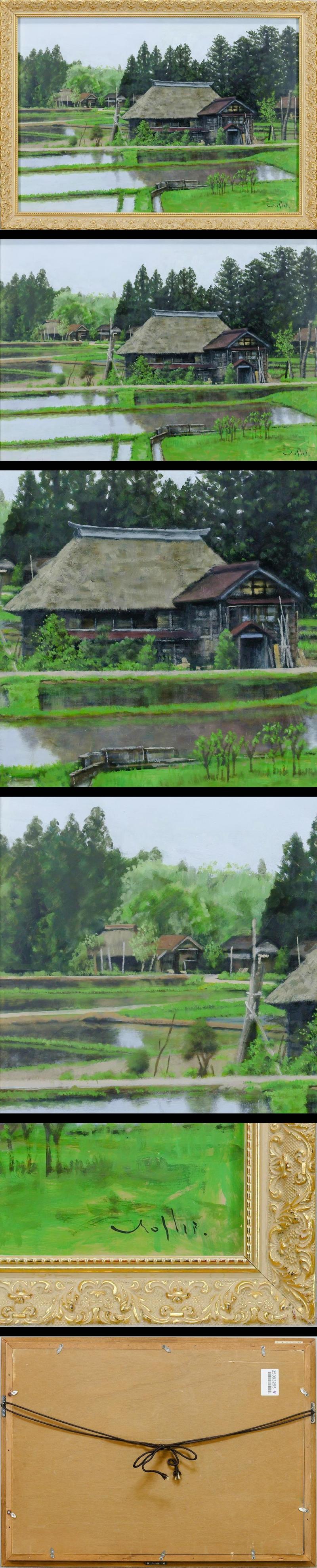 【WISH】サイン有 油彩 15号 大作 ◆日本の原風景・水田に映る茅葺き古民家 #25093295