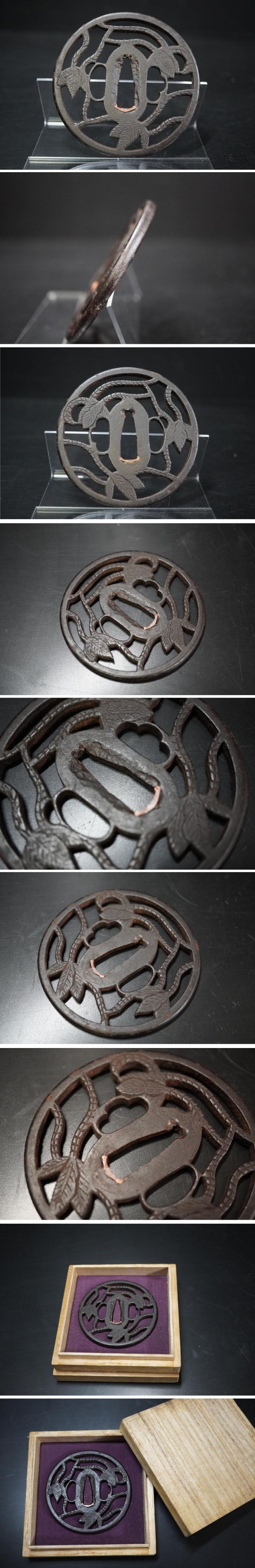 ご覧いただきありがとうございます。 刀鍔 鉄地 赤坂透 草桐葉透鍔 刀装品 鍔箱付です。 擦れ疵、サビ、汚れ等ありますが、状態は良好です。