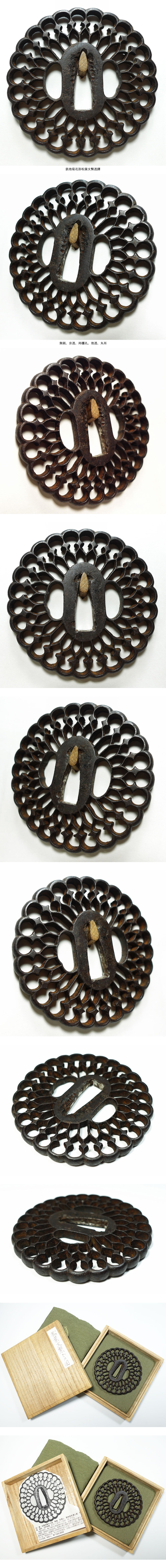 | 【鐔99】鉄地菊花形松葉文繋透鐔 無銘 京透し 桐箱入 | 鉄地菊花形松葉文繋透鐔、無銘、京透し、両櫃孔、地透、丸耳、桐箱入りです。デザイン性の高い洗練された京透しの名品です。