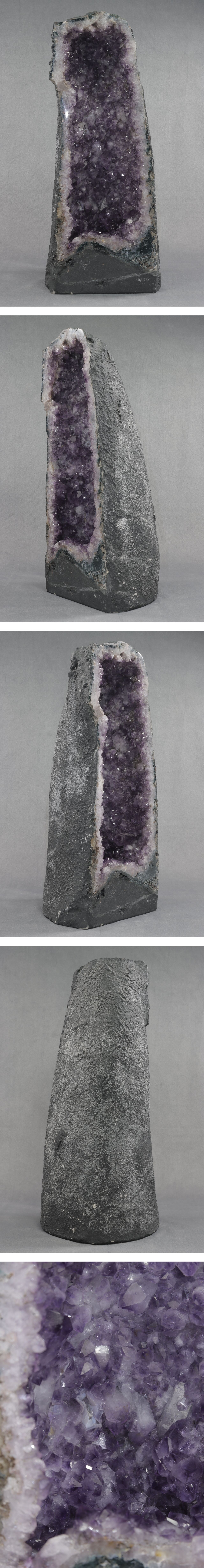 つらら状を半面にカットし、断面を滑らかに研磨しており、高さで50cmを超え、重量は24kあるドームの立ち姿は迫力あり、アメジストの深い紫の色味が目を惹く原石。