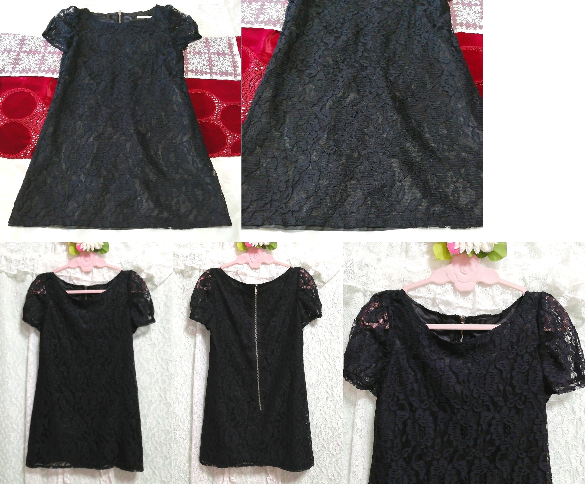 黒レース半袖チュニック ネグリジェ ナイトウェア ワンピース Black lace short sleeve tunic negligee nightwear dress
