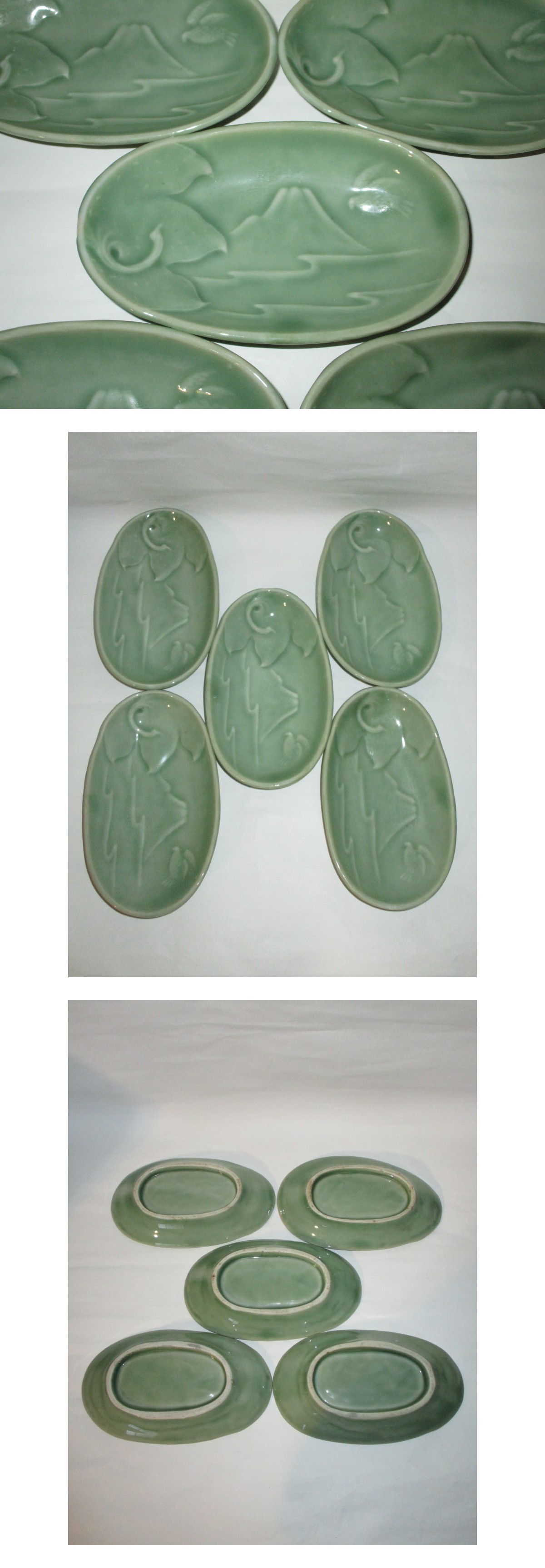 【明治時代頃】古伊万里 青磁 陽刻 浮彫 茄子型皿 5客 (幅最大16.8㎝) 富士山・鷹・なすび