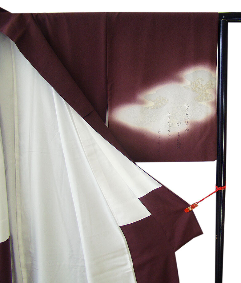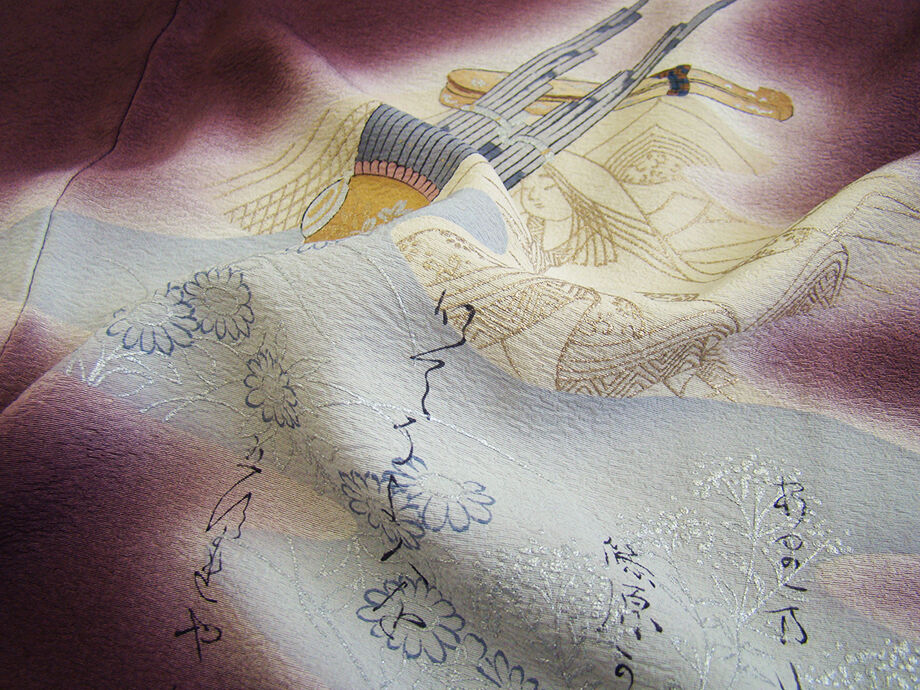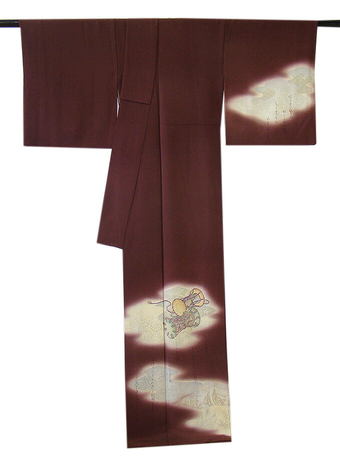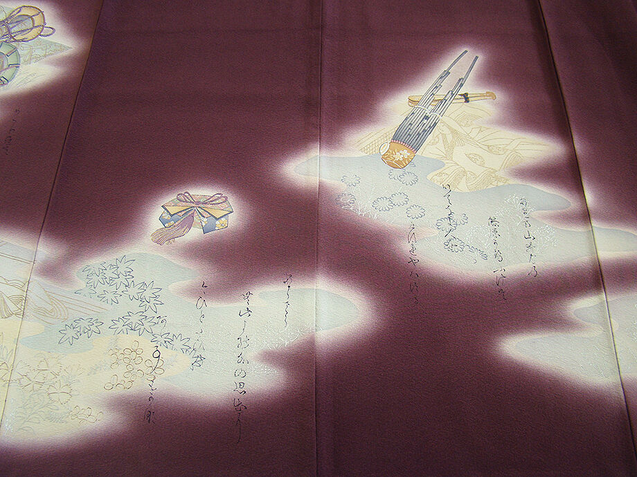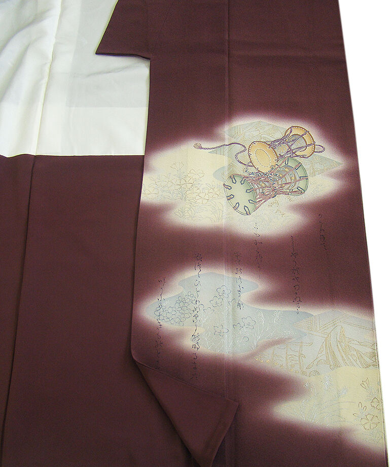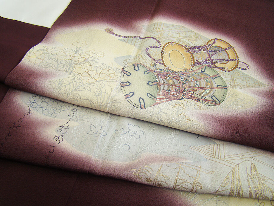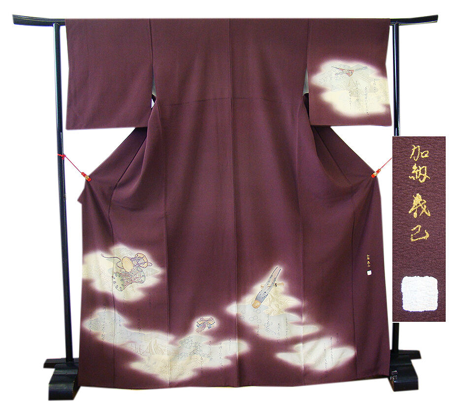 | 商品説明 | こちらのお品は「袷」ですので10月から5月までお召頂ければと思います。 しなやかで滑らかな手触りの着心地良い重めの極上ちりめん地の生地、 渋い紫鳶色地に灰青色、象牙色ぼかしに鼓、和楽器文、青海波、花草や平安柄の染柄に 歌入りに金銀彩加工染、 八掛は共色(正絹)、作家「加納義己」作の落款が入っております。 |