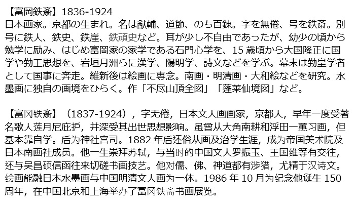 日本画家富岡鉄斎の孫、曄の長男。鉄斎作品鑑定の第一人者。研究誌「鉄斎研究」の発行に尽力した。平成3年(1991)歿、83才。