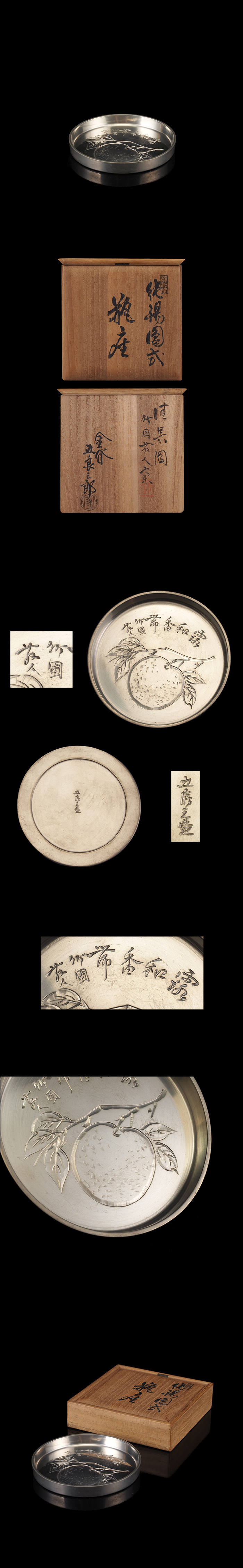 【夢工房】十三代 金谷 五郎三郎 造 竹圃茶人 稿 漢詩 清果図 純錫 円式 瓶座 共箱 重量113g PE-248