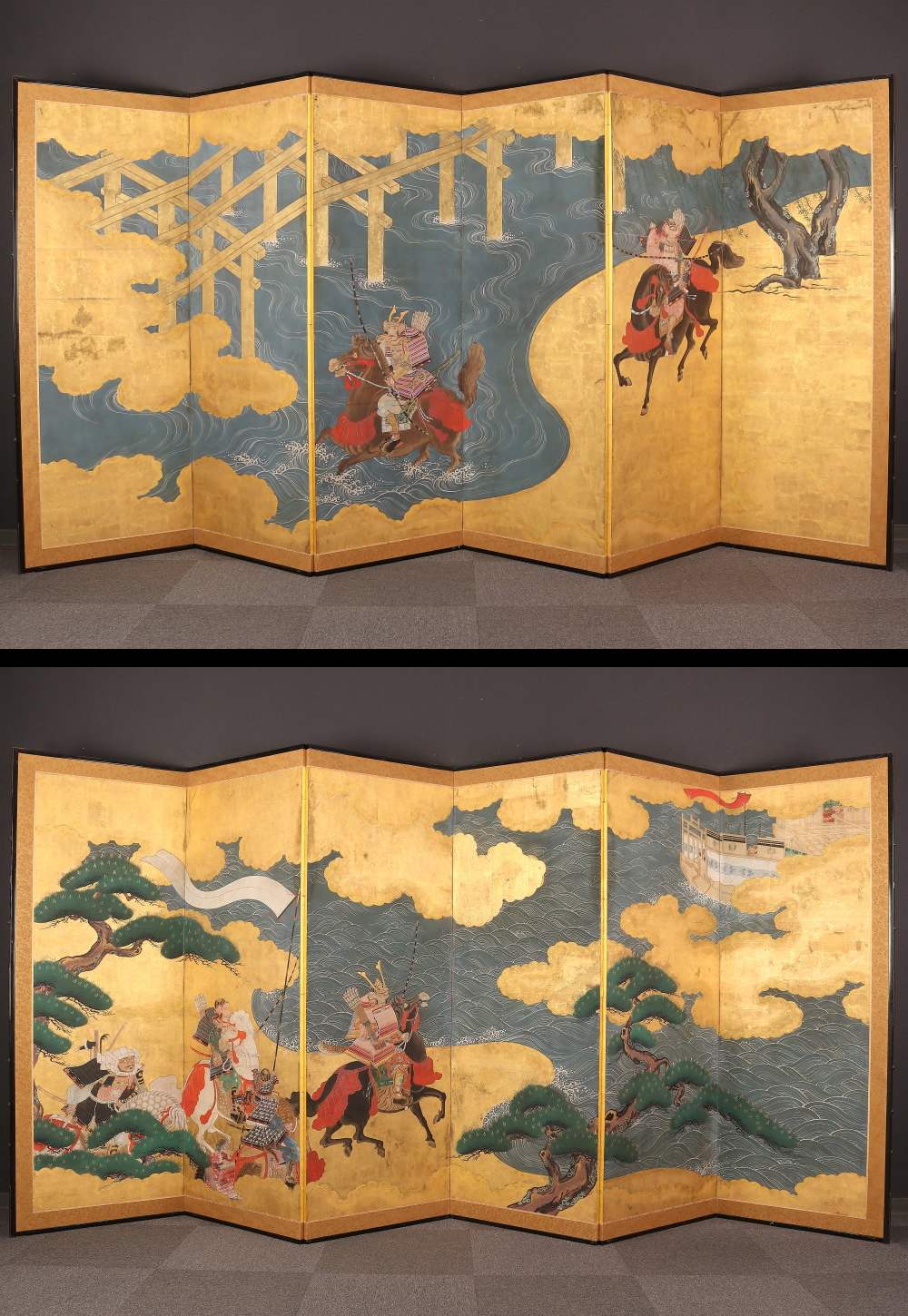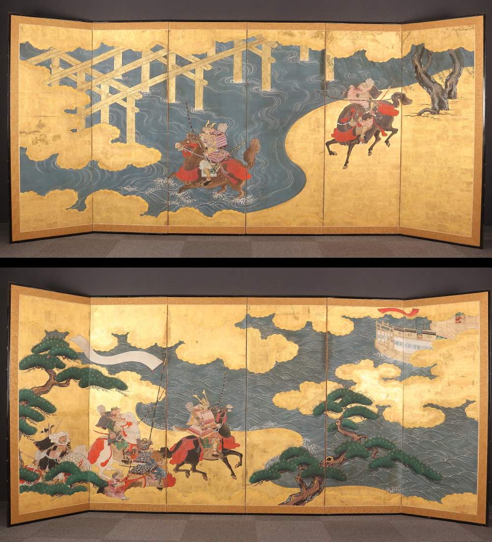 【伝来】am7547 源平合戦図屏風 武蔵坊弁慶 源義経 金地一双 源義経の従臣 豪傑 牛若丸 平安時代末期の武将
