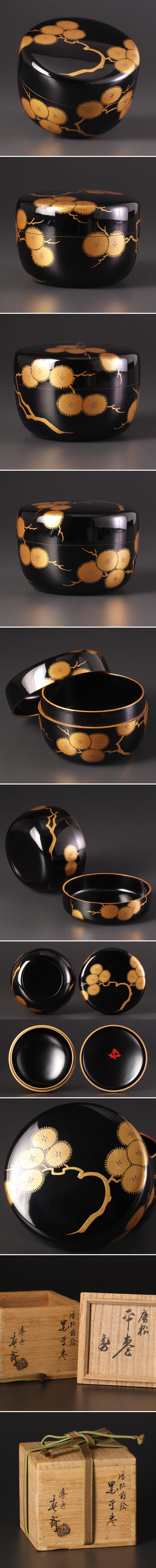 つややかな黒地に唐松の蒔絵が施されています。黒と金彩のコントラストが美しい作品です。 ★商品は前端春斎作、鵬雲斎書付の作品である事を保証致します。 |