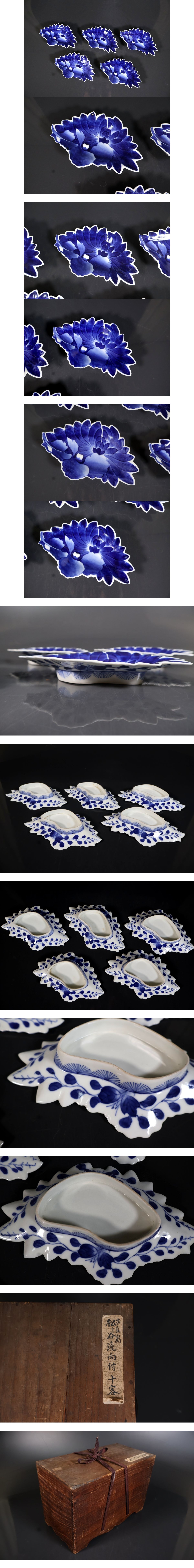 【小】5302 江戸期 古鍋島 松ケ谷手 鍋島牡丹形染付皿 五客 向付 変形皿 鍋島染付 時代箱有