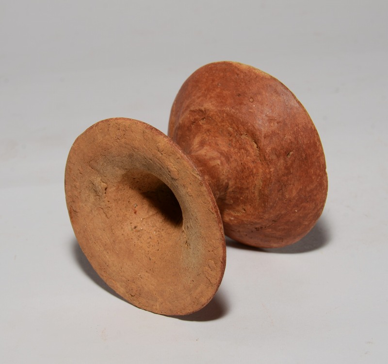 弥生時代後期から古墳時代初期にかけての丹塗土器高坏です。こんなに小さな高坏はあまり見たことがありません。小さいながらも凛とした立ち姿で、丹塗りされているのも稀少だと思います。大きさは、径:約7.5cm、高さ:約6.4cmです。口縁に割れ接ぎがござますが、全て共片を繋いだものです。その他、奇跡的に傷や直しはありません。皆様、どうかよろしくお願いいたします。